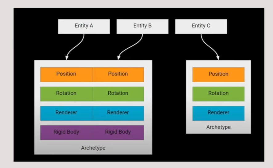 - 举个例子,这里由Position、Rotation、Renderer、Rigid Body四个Component组件组合成的Entity A与Entity B共享一种原型,而由Position、Rotation、Renderer三个组件组合成的Entity C则属于另外一种原型