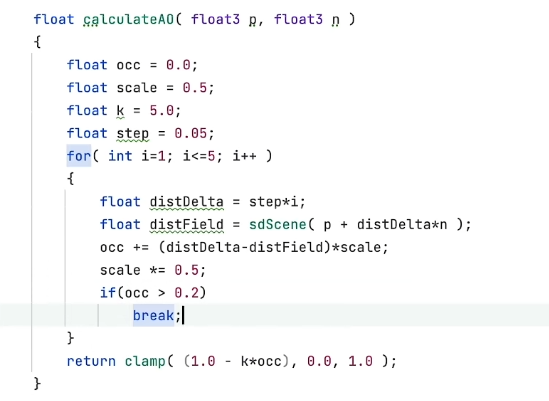 - 由于衰减过快,可能后几次的增加值非常小,所以可以在遮蔽值达到一定值后直接跳出循环,放弃后面的增量值occ的计算