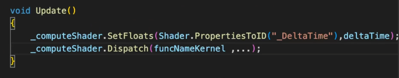 1 2 3 4 5 6 7 8 9 10 11 12 13 14 15 16 [SerializeField ] private Material material; [SerializeField ] private ComputeShader particleCS; private int kernelUpdateParticleHandle;private void Start (){ InitParticleData(); InitComputeShader(); } private void InitComputeShader (){ kernelUpdateParticleHandle = particleCS.FindKernel("UpdateParticle" ); particleCS.SetBuffer(kernelUpdateParticleHandle, "ParticleBuffer" , particleBuffer); }