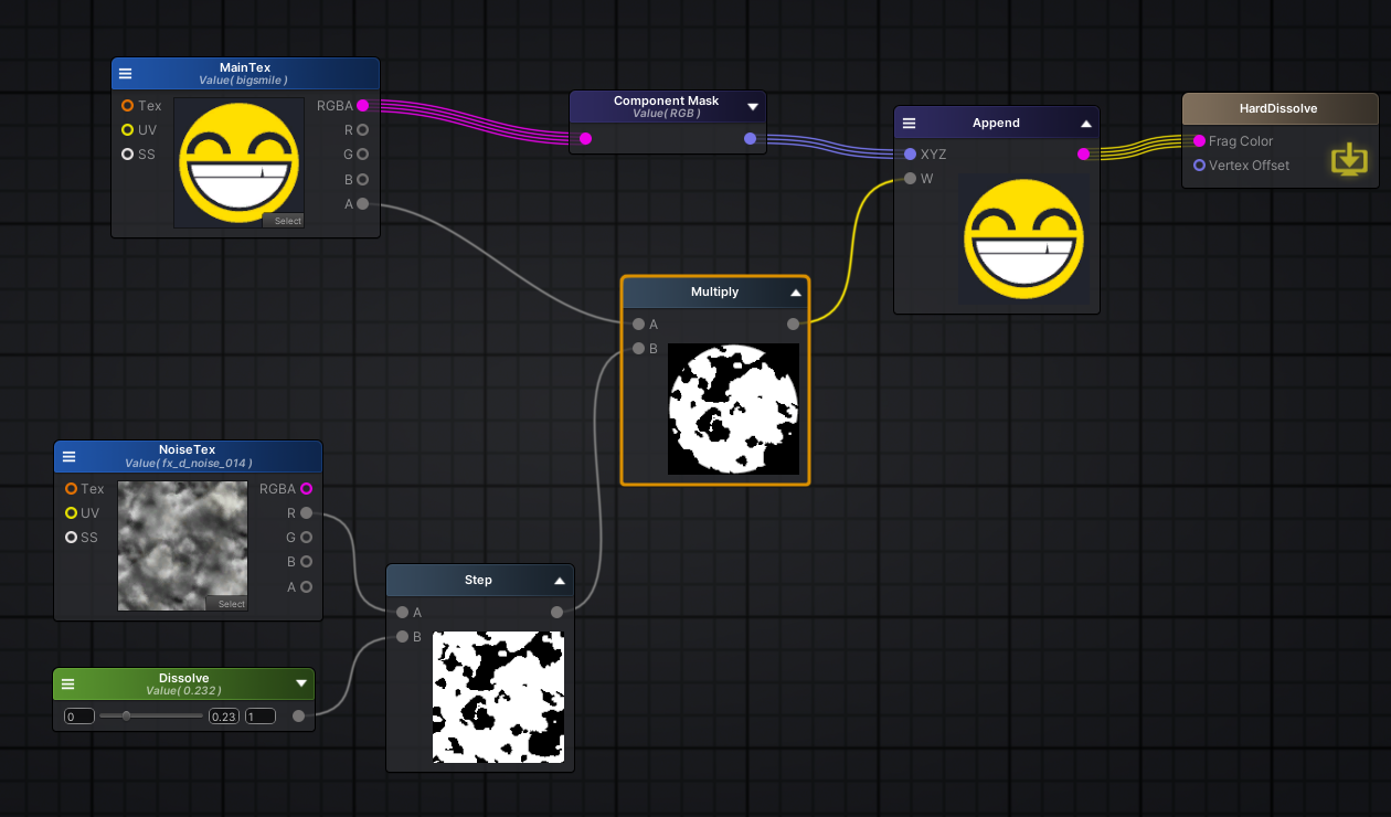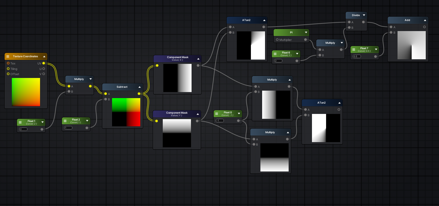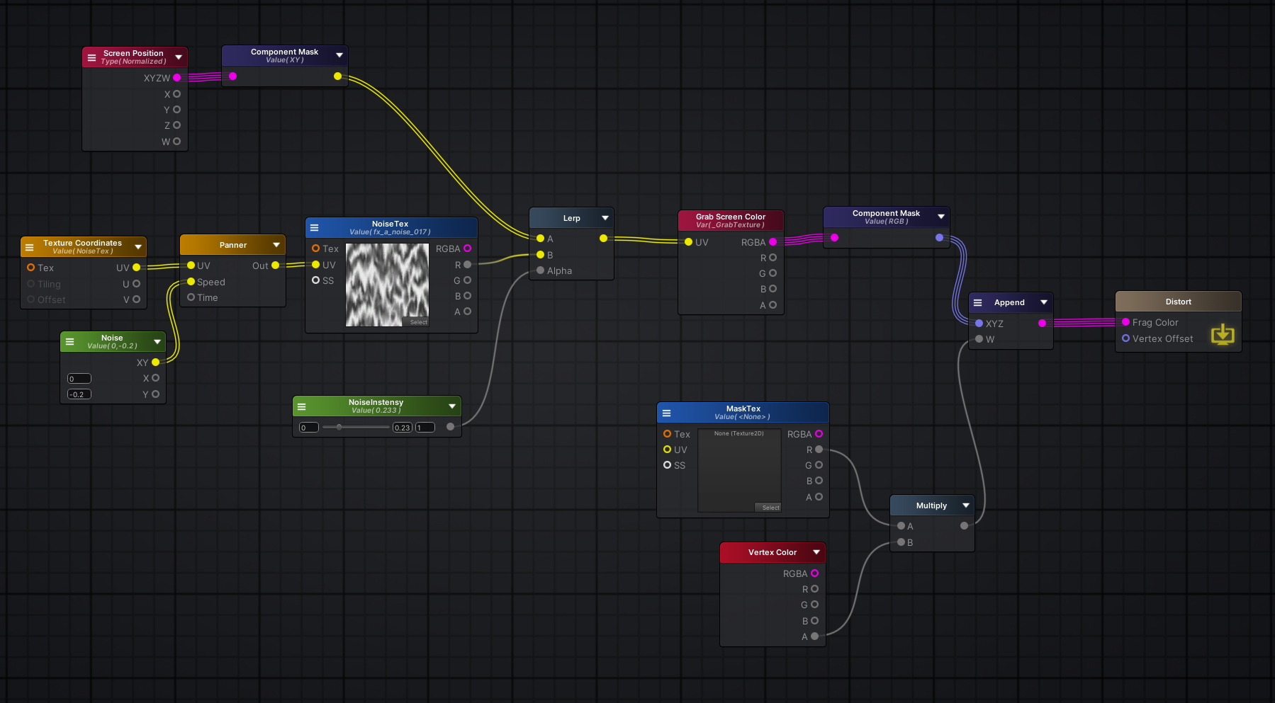 #ifdef ASE_NEEDS_FRAG_WORLD_POSITION o.worldPos = mul(unity_ObjectToWorld, v.vertex).xyz; #endif return o; } float4 frag (v2f i ) : SV_Target { UNITY_SETUP_INSTANCE_ID(i); UNITY_SETUP_STEREO_EYE_INDEX_POST_VERTEX(i); float4 finalColor; #ifdef ASE_NEEDS_FRAG_WORLD_POSITION float3 WorldPosition = i.worldPos; #endif float mulTime18 = _Time.y * _TimeScaleOffset.x; float2 appendResult16 = (float2(_Speed.x , _Speed.y)); float4 screenPos = i.ase_texcoord1; float4 ase_screenPosNorm = screenPos / screenPos.w; ase_screenPosNorm.z = ( UNITY_NEAR_CLIP_VALUE >= 0 ) ? ase_screenPosNorm.z : ase_screenPosNorm.z * 0.5 + 0.5; float2 appendResult9 = (float2(ase_screenPosNorm.x , ase_screenPosNorm.y)); float2 appendResult35 = (float2(ase_screenPosNorm.x , ase_screenPosNorm.y)); float2 temp_output_36_0 = (appendResult35*2.0 + -1.0); float2 break43 = temp_output_36_0; float2 appendResult46 = (float2(length( temp_output_36_0 ) , (0.0 + (atan2( break43.y , break43.x ) - 0.0) * (1.0 - 0.0) / (UNITY_PI - 0.0)))); float2 lerpResult48 = lerp( appendResult9 , appendResult46 , _toggleUV); float2 appendResult13 = (float2(_TillingOffset.x , _TillingOffset.y)); float2 appendResult14 = (float2(_TillingOffset.z , _TillingOffset.w)); float2 panner10 = ( ( mulTime18 + _TimeScaleOffset.y ) * appendResult16 + (lerpResult48*appendResult13 + appendResult14)); float4 tex2DNode1 = tex2D( _MainTex, panner10 ); float2 appendResult33 = (float2(_MaskTillingOffset.x , _MaskTillingOffset.y)); float2 appendResult32 = (float2(_MaskTillingOffset.z , _MaskTillingOffset.w)); float4 appendResult5 = (float4(( tex2DNode1 * _Color * _Scale * i.ase_color ).rgb , ( _Alpha * ( ( tex2DNode1.r * _RGBA_Mask.x ) + ( tex2DNode1.g * _RGBA_Mask.y ) + ( tex2DNode1.b * _RGBA_Mask.z ) + ( tex2DNode1.a * _RGBA_Mask.w ) ) * ( tex2D( _Mask, (appendResult9*appendResult33 + appendResult32) ) * _MaskScale ) ).r)); finalColor = appendResult5; return finalColor; } ENDCG } } CustomEditor "ASEMaterialInspector" Fallback Off } /*ASEBEGIN Version=19302 Node;AmplifyShaderEditor.ScreenPosInputsNode;8;-3424.466,-503.7861;Float;False;0;False;0;5;FLOAT4;0;FLOAT;1;FLOAT;2;FLOAT;3;FLOAT;4 Node;AmplifyShaderEditor.DynamicAppendNode;35;-3189.624,-261.7405;Inherit;True;FLOAT2;4;0;FLOAT;0;False;1;FLOAT;0;False;2;FLOAT;0;False;3;FLOAT;0;False;1;FLOAT2;0 Node;AmplifyShaderEditor.ScaleAndOffsetNode;36;-2867.845,-257.2079;Inherit;True;3;0;FLOAT2;0,0;False;1;FLOAT;2;False;2;FLOAT;-1;False;1;FLOAT2;0 Node;AmplifyShaderEditor.BreakToComponentsNode;43;-2595.251,77.86584;Inherit;False;FLOAT2;1;0;FLOAT2;0,0;False;16;FLOAT;0;FLOAT;1;FLOAT;2;FLOAT;3;FLOAT;4;FLOAT;5;FLOAT;6;FLOAT;7;FLOAT;8;FLOAT;9;FLOAT;10;FLOAT;11;FLOAT;12;FLOAT;13;FLOAT;14;FLOAT;15 Node;AmplifyShaderEditor.PiNode;55;-2457.88,369.1848;Inherit;False;1;0;FLOAT;1;False;1;FLOAT;0 Node;AmplifyShaderEditor.ATan2OpNode;44;-2421.251,83.86584;Inherit;True;2;0;FLOAT;0;False;1;FLOAT;0;False;1;FLOAT;0 Node;AmplifyShaderEditor.LengthOpNode;37;-2464.544,-243.7079;Inherit;True;1;0;FLOAT2;0,0;False;1;FLOAT;0 Node;AmplifyShaderEditor.TFHCRemapNode;45;-2168.252,115.8658;Inherit;False;5;0;FLOAT;0;False;1;FLOAT;0;False;2;FLOAT;3.141593;False;3;FLOAT;0;False;4;FLOAT;1;False;1;FLOAT;0 Node;AmplifyShaderEditor.Vector4Node;12;-1617.439,-203.2669;Inherit;False;Property;_TillingOffset;TillingOffset;6;0;Create;True;0;0;0;False;0;False;1,1,0,0;1,1,0,0;0;5;FLOAT4;0;FLOAT;1;FLOAT;2;FLOAT;3;FLOAT;4 Node;AmplifyShaderEditor.Vector2Node;51;-1485.661,136.278;Inherit;False;Property;_TimeScaleOffset;TimeScaleOffset;11;0;Create;True;0;0;0;False;0;False;1,1;1,0;0;3;FLOAT2;0;FLOAT;1;FLOAT;2 Node;AmplifyShaderEditor.DynamicAppendNode;9;-1480.383,-443.9041;Inherit;False;FLOAT2;4;0;FLOAT;0;False;1;FLOAT;0;False;2;FLOAT;0;False;3;FLOAT;0;False;1;FLOAT2;0 Node;AmplifyShaderEditor.RangedFloatNode;49;-1707.343,-335.0562;Inherit;False;Property;_toggleUV;主贴图UV是否极坐标;0;1;[Enum];Create;False;0;2;Off;0;On;1;0;False;0;False;1;1;0;0;0;1;FLOAT;0 Node;AmplifyShaderEditor.DynamicAppendNode;46;-1975.829,-150.7183;Inherit;True;FLOAT2;4;0;FLOAT;0;False;1;FLOAT;0;False;2;FLOAT;0;False;3;FLOAT;0;False;1;FLOAT2;0 Node;AmplifyShaderEditor.DynamicAppendNode;14;-1396.439,-113.2668;Inherit;False;FLOAT2;4;0;FLOAT;0;False;1;FLOAT;0;False;2;FLOAT;0;False;3;FLOAT;0;False;1;FLOAT2;0 Node;AmplifyShaderEditor.DynamicAppendNode;13;-1397.439,-206.2669;Inherit;False;FLOAT2;4;0;FLOAT;0;False;1;FLOAT;0;False;2;FLOAT;0;False;3;FLOAT;0;False;1;FLOAT2;0 Node;AmplifyShaderEditor.Vector2Node;50;-1441.661,10.27795;Inherit;False;Property;_Speed;Speed;10;0;Create;True;0;0;0;False;0;False;1,1;1,1;0;3;FLOAT2;0;FLOAT;1;FLOAT;2 Node;AmplifyShaderEditor.SimpleTimeNode;18;-1134.07,126.9291;Inherit;False;1;0;FLOAT;1;False;1;FLOAT;0 Node;AmplifyShaderEditor.LerpOp;48;-1222.343,-422.0562;Inherit;False;3;0;FLOAT2;0,0;False;1;FLOAT2;0,0;False;2;FLOAT;0;False;1;FLOAT2;0 Node;AmplifyShaderEditor.DynamicAppendNode;16;-1125.502,2.695892;Inherit;False;FLOAT2;4;0;FLOAT;0;False;1;FLOAT;0;False;2;FLOAT;0;False;3;FLOAT;0;False;1;FLOAT2;0 Node;AmplifyShaderEditor.Vector4Node;31;-1095.063,854.8722;Inherit;False;Property;_MaskTillingOffset;MaskTillingOffset;7;0;Create;True;0;0;0;False;0;False;1,1,0,0;1,1,0,0;0;5;FLOAT4;0;FLOAT;1;FLOAT;2;FLOAT;3;FLOAT;4 Node;AmplifyShaderEditor.SimpleAddOpNode;19;-939.0702,162.9291;Inherit;False;2;2;0;FLOAT;0;False;1;FLOAT;0;False;1;FLOAT;0 Node;AmplifyShaderEditor.ScaleAndOffsetNode;11;-1133.439,-234.267;Inherit;False;3;0;FLOAT2;0,0;False;1;FLOAT2;1,0;False;2;FLOAT2;0,0;False;1;FLOAT2;0 Node;AmplifyShaderEditor.DynamicAppendNode;32;-874.064,944.8725;Inherit;False;FLOAT2;4;0;FLOAT;0;False;1;FLOAT;0;False;2;FLOAT;0;False;3;FLOAT;0;False;1;FLOAT2;0 Node;AmplifyShaderEditor.DynamicAppendNode;33;-875.064,851.8722;Inherit;False;FLOAT2;4;0;FLOAT;0;False;1;FLOAT;0;False;2;FLOAT;0;False;3;FLOAT;0;False;1;FLOAT2;0 Node;AmplifyShaderEditor.PannerNode;10;-816.4438,-101.9479;Inherit;False;3;0;FLOAT2;0,0;False;2;FLOAT2;0,0;False;1;FLOAT;1;False;1;FLOAT2;0 Node;AmplifyShaderEditor.SamplerNode;1;-61